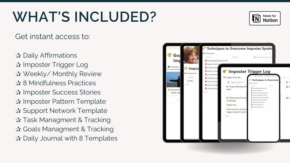 This Notion OS equips you with Notion templates to work on all of your imposter patterns.