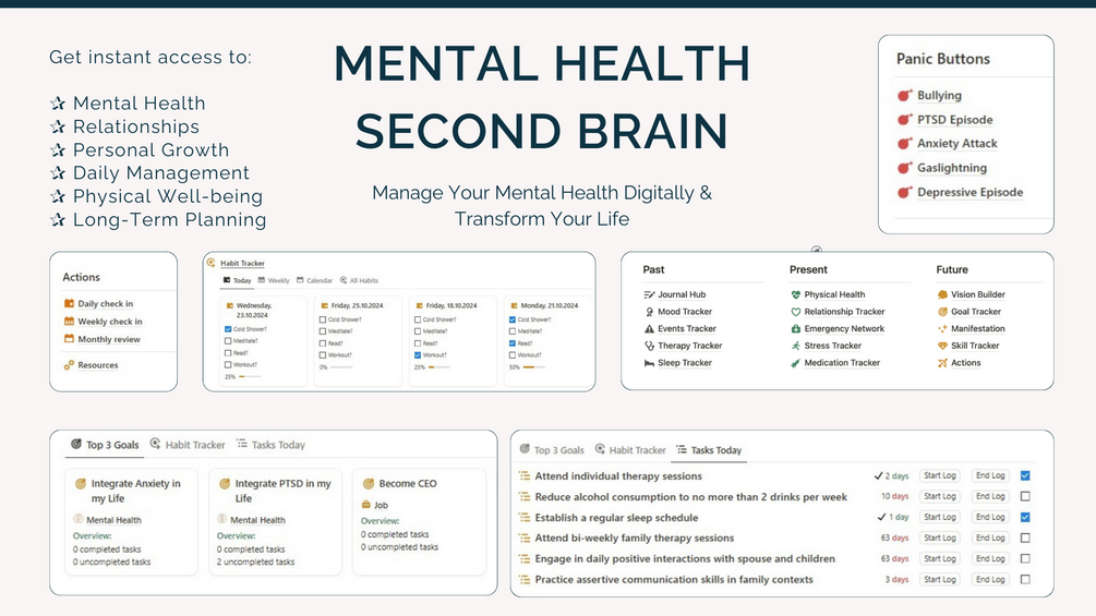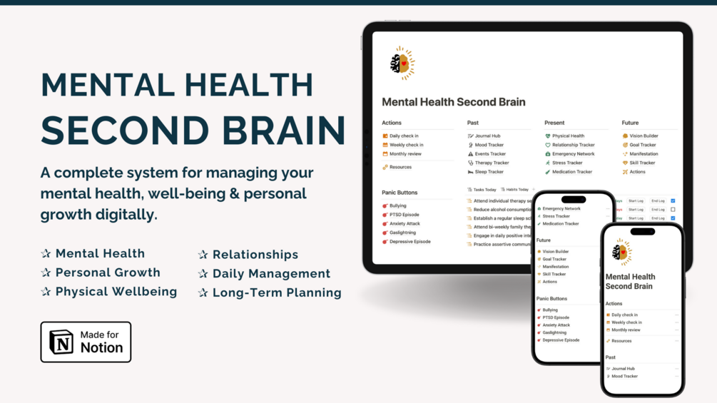Mental Health Second Brain is a comprehensive Notion workspace designed to help you manage all aspects of your mental health.