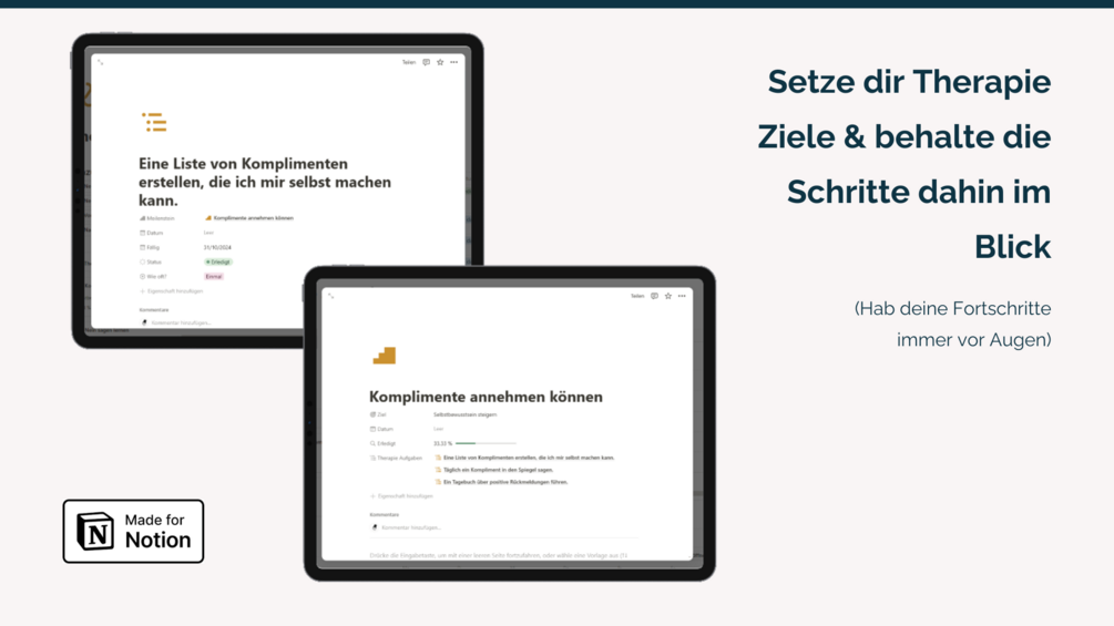 ✔ Ziele setzen & nachverfolgen: Formuliere Therapieziele, unterteile sie in konkrete Aufgaben und behalte deine Fortschritte stets im Blick.
