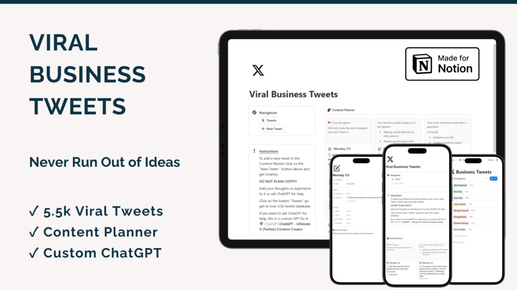 With the Viral Business Tweets template, you’ll have everything you need to create impactful content, grow your audience, and build your brand with confidence.