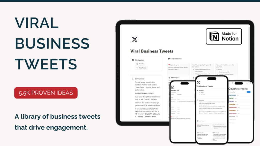 With the Viral Business Tweets template, you’ll have an organized, interactive system to help you craft engaging business tweets that resonate with your audience.